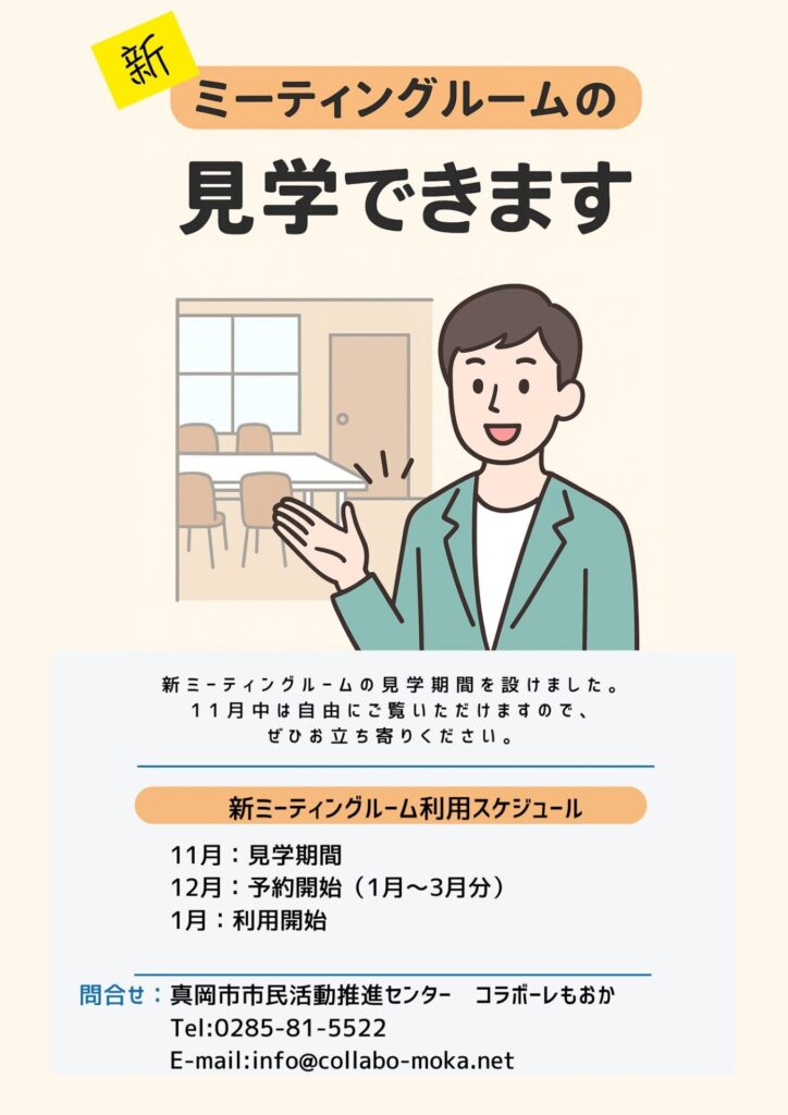 日頃よりコラボーレもおかWebサイトの運営にご協力いただき、誠にありがとうございます。この度、ミーティングルームを1部屋増設し、お使いいただけるようになりました。それに伴い、ミーティングルームに関連する規約や情報を更新中 […]