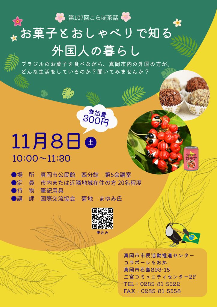 【第107回こらぼ茶話☕️ お菓子とおしゃべりで知る🍬外国人の暮らし】 《日 時》:🗓️11月8日(土)10:00~11:30 《場 所》:📍真岡公民館 西分館 第5会議室 《参加費》:300円 《持 物》:筆記用具 《定 員》:市内または近隣地域在住の方 20名程度 《講 師》:真岡市国際交流協会 菊地まゆみ氏